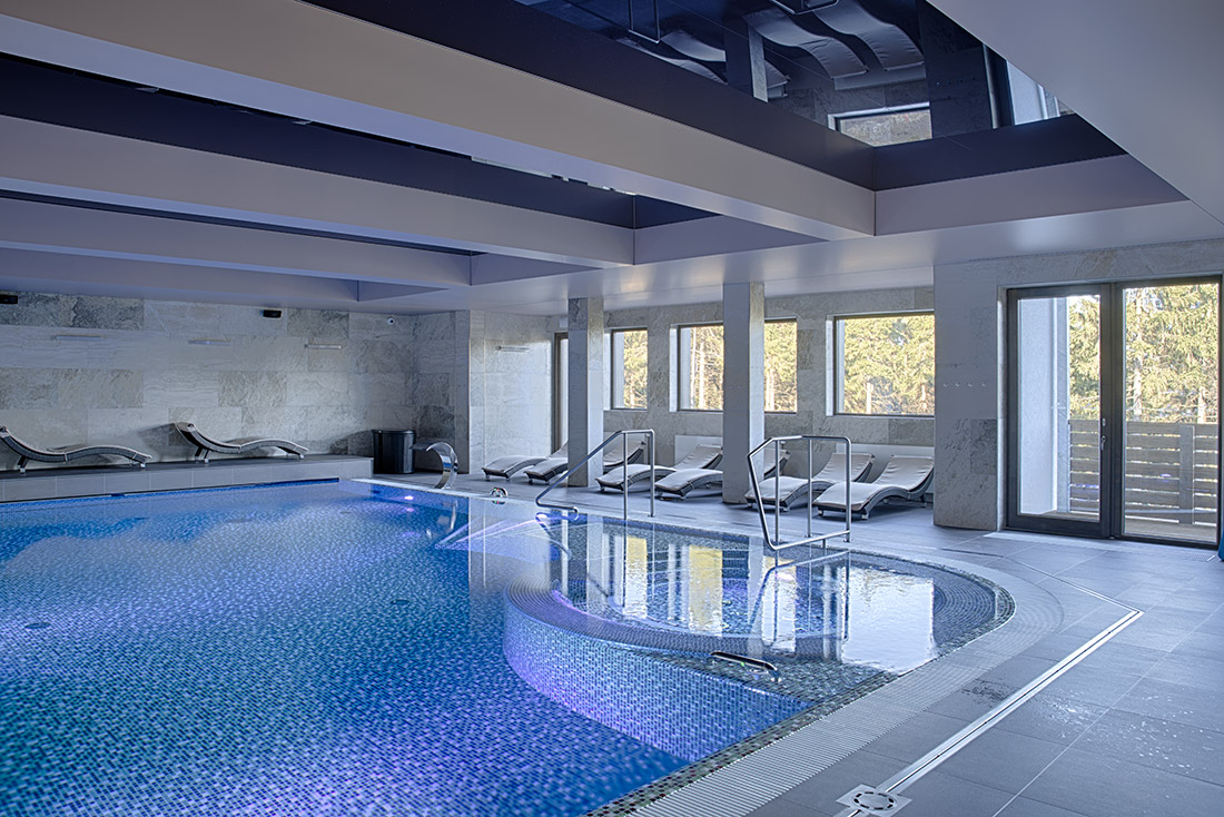 Dopřejte si osvěžující koupel v našem krytém vyhřívaném bazénu (rozměry 12 x 6 m)  s masážními tryskami, a vodopádem. Odpočívejte ve vířivce a uvolněte své unavené svaly v sauně s výhledem do lesa. V letních měsících si můžete dopřát i relax na venkovní terase.